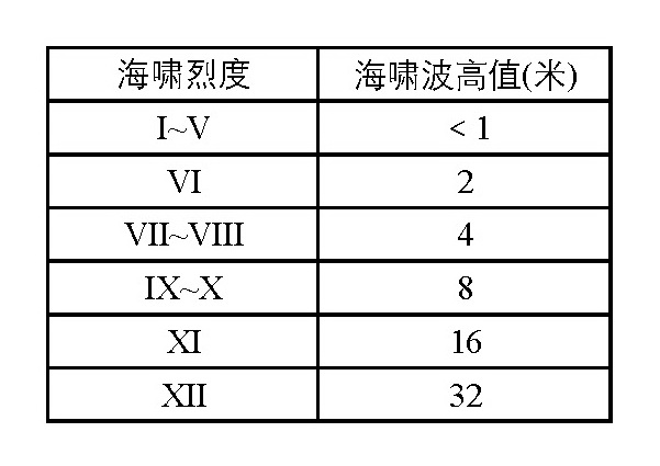 烈度等级表海啸烈度的概念首先由德国科学家西贝格(A.Sieberg)提出,并在1962年由尼古拉斯•安布拉塞斯(Nicholas N. Ambraseys)继承并发扬,提出了一个6级海啸烈度表,描述如下: (1)非常轻微。海啸波非常微弱以致于肉眼无法觉察到,只能依靠潮位仪监测到; (2)轻微。通常只有在较平坦的海滨地区,只有那些长期居住在海边或长期从事海上作业的人才能察觉到海啸波; (3)较强烈。一般人都能察觉到海啸波的存在,小型船只被冲上海岸,岸边房屋轻微破坏,海水倒灌入河流; (4)强烈。沿岸护堤破坏严重,岸边房屋严重受损,大型帆船或小型渔船被冲上海岸或冲向外海,沿岸漂浮大量残垣碎片; (5)非常强烈。部分房屋及沿岸挡水墙坍塌毁坏,耕田冲毁,海滨凌乱不堪、杂乱无章,到处是海洋漂浮物和动植物尸体,所有船只都被冲上海岸或冲向外海,河流入海口出现怒潮现象,港口工程严重破坏,人员有伤亡; (6)灾难性的。海水侵入内陆,远离岸边的人工建筑物遭受不同程度的毁坏,大型船只严重毁坏,树木连根拔起,众多人员伤亡。 2001年希腊的杰拉西莫斯•帕帕多普洛斯(Gerassimos A. Papadopoulos)和日本的今村文彦(Fumihiko Imamura)借鉴修正的麦加利地震烈度表(Modified Mercalli Intensity Scale,MMI),利用海啸所造成破坏的宏观描述,将海啸烈度也划分为12个等级,充分考虑了海啸对人类和自然环境所造成的影响,划分指标主要有三类:a)人的感觉;b)物体反应(例如船只的活动);c)建筑物的破坏程度。具体描述如下: I.无感 a)即便在最有利的环境条件下,无人有感觉 b)对物体没有任何影响 c)建筑物没有任何破坏 II.几乎无感 a)极少数小船上的人能感觉到;海岸上的人毫无察觉 b)对物体没有任何影响 c)建筑物没有任何破坏 III.弱感 a)大部分小船上的人能感觉到;极少数岸上的人能察觉到 b)对物体没有任何影响 c)建筑物没有任何破坏 IV.中感 a)所有小船上的人能感觉到,极少数大船上的人也能感觉到;岸上大部分人能察觉到 b)少数小船小幅冲上海岸 c)建筑物没有任何破坏 V.强感 a)所有大船上的人都能感觉到;所有岸上的人也都能察觉到,少数人会感到害怕并奔向高地 b)大量小船被冲上海岸,有些相互冲撞或翻转;部分沙滩经冲刷留下层状痕迹;涌浪侵淹耕地 c)涌浪侵淹近海建筑的户外设施(如花园等) VI.轻微破坏 a)许多人感到恐惧而奔向高地 b)大部分小船猛烈冲上海岸,相互冲撞或翻转 c)涌浪侵淹并破坏部分木结构 VII.中等破坏 a)大部分人感到恐惧而奔向高地 b)大量小船毁坏,部分大船剧烈摇晃;各种物体翻转、漂流;沙滩呈层状并且卵石堆积;部分水产养殖筏被冲走 c)大量木结构遭受破坏,部分已坍塌或被冲走;涌浪侵淹部分砌体建筑物并造成1级破坏 VIII.严重破坏 a)所有人逃向高地,有些却被冲走 b)大部分小船毁坏,许多被冲走,部分大船冲向海岸或相互撞击;海滨杂乱无章,漂浮着各类物体;海啸防护林受轻微破坏;大量水产养殖筏被冲走,部分毁坏 c)大部分木结构被冲走或坍塌;部分砌体建筑物遭受2级破坏;大部分钢筋混凝土建筑物遭破坏,部分遭受1级破坏及涌浪浸淹 IX.毁坏 a)许多人被冲走 b)大部分小船毁坏或被冲走,大量大船猛烈冲上海岸,部分毁坏;海滨极其杂乱;局部底层塌陷;海啸防护林部分毁坏;大部分水产养殖筏被冲走,大量毁坏 c)大量砌体建筑物遭受3级破坏;部分钢筋混凝土建筑物遭受2级破坏 X.严重毁坏 a)引起社会恐慌,沿岸大部分人被冲走 b)大部分大船猛烈冲上海岸,大量毁坏或撞塌沿岸建筑物;海底小石块向内陆移动;汽车翻转、漂流;油气泄露、引起火灾;地层严重塌陷 c)大量砌体建筑物遭受4级破坏;部分钢筋混凝土建筑物遭受3级破坏;海堤坍塌 XI.毁灭 b)生命线中断;火灾严重;退潮海水使汽车及其它物体漂流向大海;海底大石块向内陆移动 c)大量砌体建筑物遭受5级破坏;部分钢筋混凝土建筑物遭受4级破坏,许多遭受3级破坏 XII.完全毁灭 c)所有砌体建筑物坍塌;大部分钢筋混凝土建筑物遭受至少3级破坏 海啸烈度表中所涉及的砌体建筑物和钢筋混凝土建筑物所遭受的破坏程度,采用了《EMS 98》(欧洲98版本地震烈度表)所规定的建筑物地震破坏等级。 >>《EMS 98》 需要说明的是,类似于划分地震烈度时,地震动加速度或速度只是参考指标,是不被采用的,因为地震所造成的破坏程度与地震动参数没有内在必然的联系。目前,海啸烈度的划分也不采用任何物理指标,包括海啸波高值。原因类似,某一地区海啸波高值很大,却非人类居住区,理所当然造成的危害就比较小,相对应的烈度就比较低;相反,某一地区海啸波高值相对较小,却人口密集,沿岸防护较差,造成的危害也就相对较大,相对应的烈度也就较高。所以,海啸波高值在划分海啸烈度是也仅作为参考而已,相互间关系见下表。
