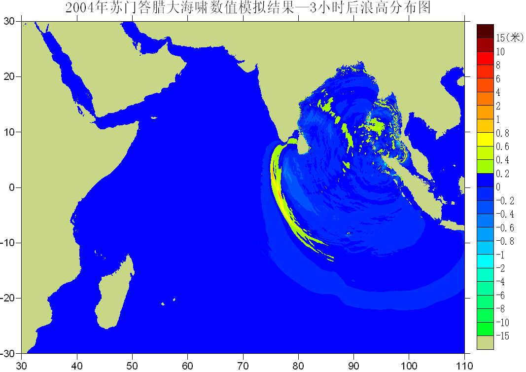 2006年12月26日印度尼西亚苏门答腊岛发生强烈地震,震中位于班达亚齐南东方向255km,北纬3.307°,东经95.947°,震级达9级。此次地震的破裂长度为1200~1300km,破裂带平面宽度约为100km,破裂面实际宽度约160km,地震破裂总面积约为18万km2。释放的能量约为4×1029erg,相当于1976年至1990年全球地震释放能量的总和,也相当于23000个广岛原子弹的能量。地震引起巨大海啸,海啸袭击了印尼、泰国、马来西亚、缅甸、孟加拉国、印度、斯里兰卡、马尔代夫、塞舌尔群岛、马达加斯加、毛里求斯、肯尼亚、索马里、坦桑尼亚等国,造成约30万人死亡、8000人失踪、超过100万人无家可归,经济损失百亿美元。中国地震局工程力学研究所(IEM)对这次海啸进行了数值模拟, 采用越洋海啸数值传播计算模型